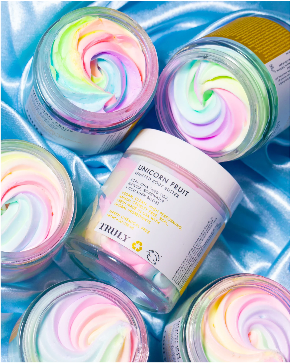 Unicorn Fruit Whipped Body Butter is a luscious, candy-scented swirl of acai, vegan collagen, matcha and shea butter to deeply hydrate, soothe, and plump skin all over. A daily essential for keeping skin smooth, strong, and smelling sweet!